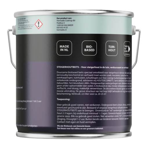 Hermadix steigerhoutbeits is speciaal ontwikkeld voor nieuw en oud steigerhout. steigerhoutbeits is een transparante beits die goed indringt in het hout. steigerhoutbeits droogt snel en is makkelijk verwerkbaar. Steigerhoutbeits is een watergedragen, mens- en milieuvriendelijk beits op basis van natuurlijke oliën.